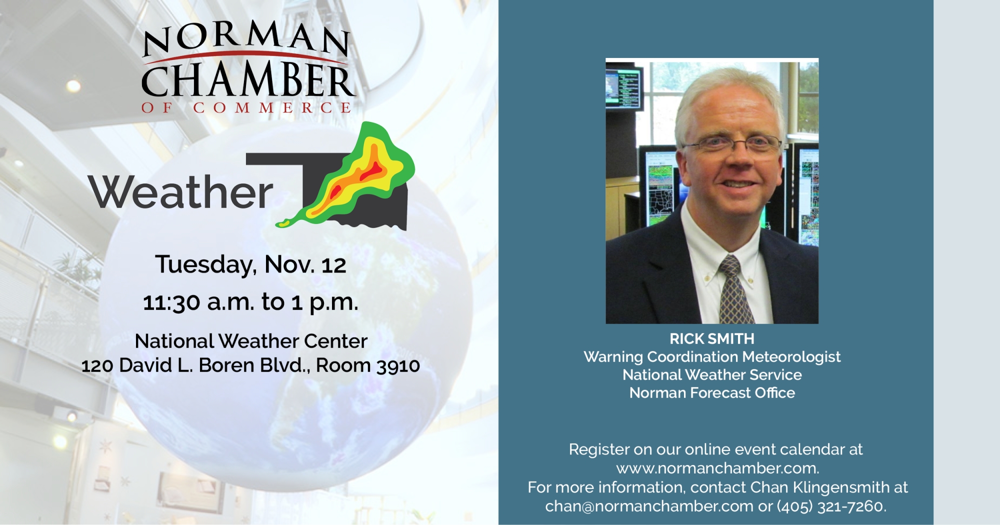 Join us for our regular lunch meeting for an informative talk about Oklahoma weather with Rick Smith, Warning Coordination Meteorologist with the National Weather Services Norman Forecast Office.