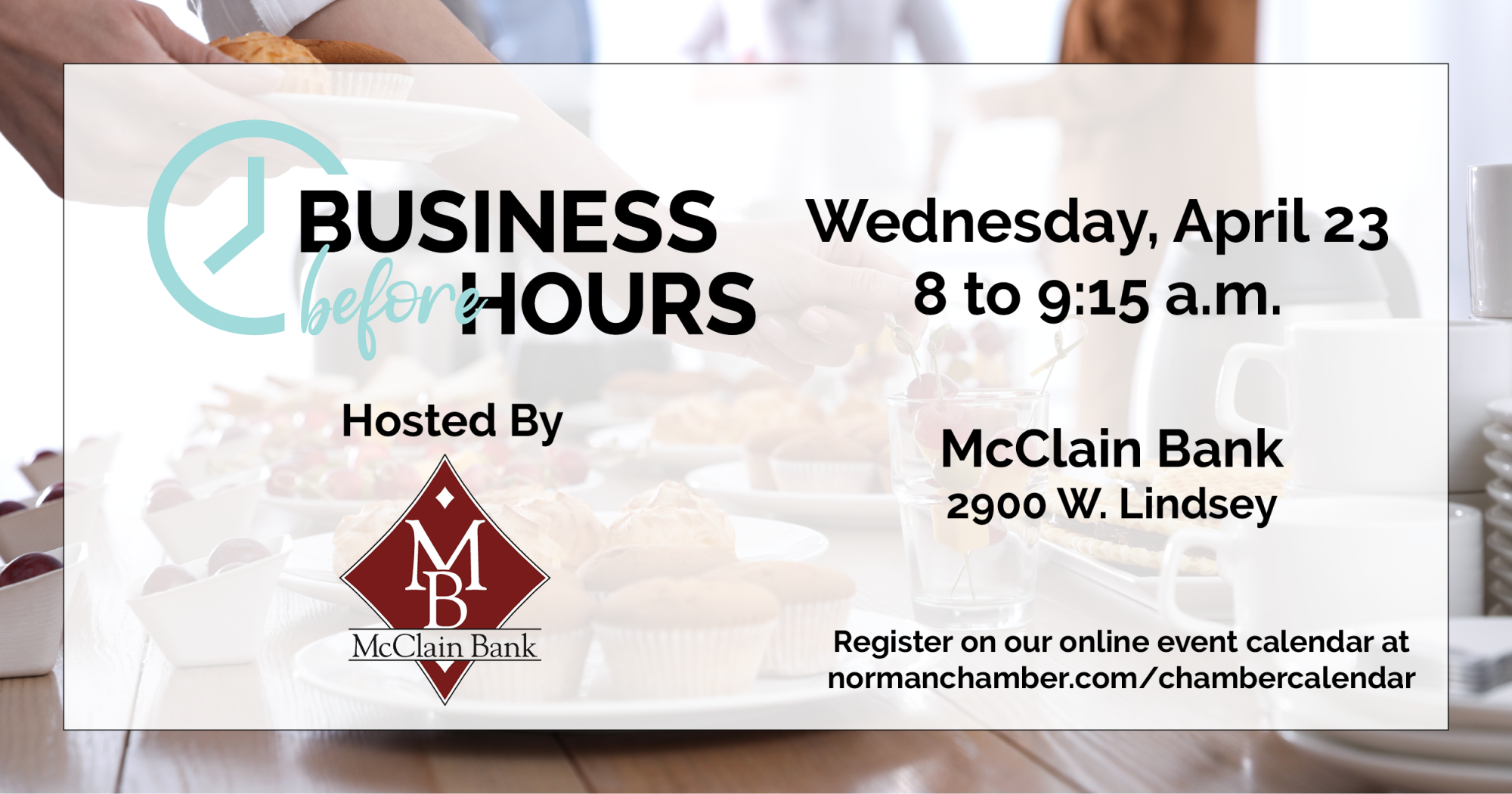 Join us to kick off your day with coffee, breakfast treats and networking at our April Business Before Hours on Wednesday, April 23, from 8-9:15 a.m., hosted by McClain Bank. Start your business day networking with 25-30 other Norman business professionals. Free for members to attend.
