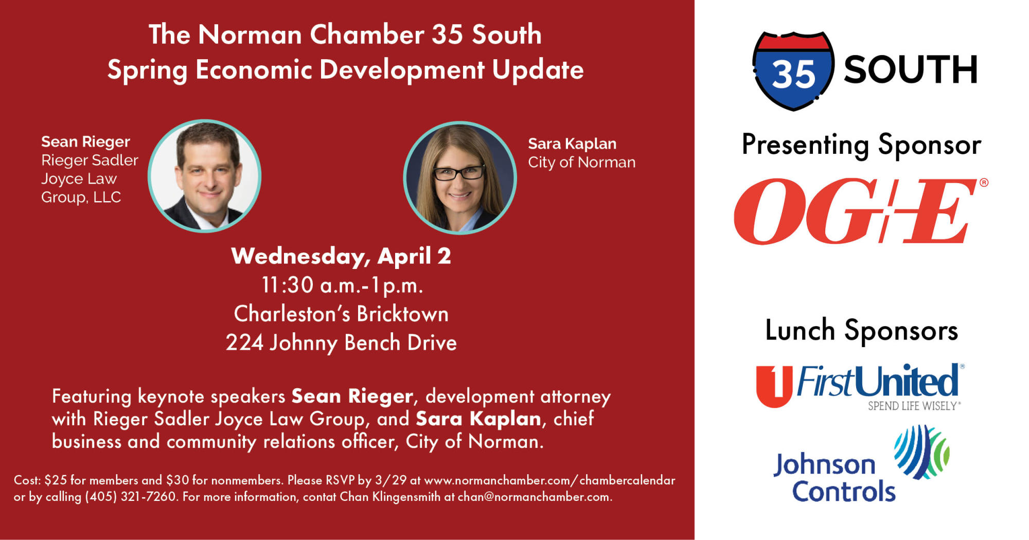 If you live in Norman, but commute to OKC, join us for an update on retail and economic development in Norman. This will be the same presentation from Sara Kaplan, City of Norman, and Sean Reiger, Reiger Law Group, as the larger luncheon on March 28.