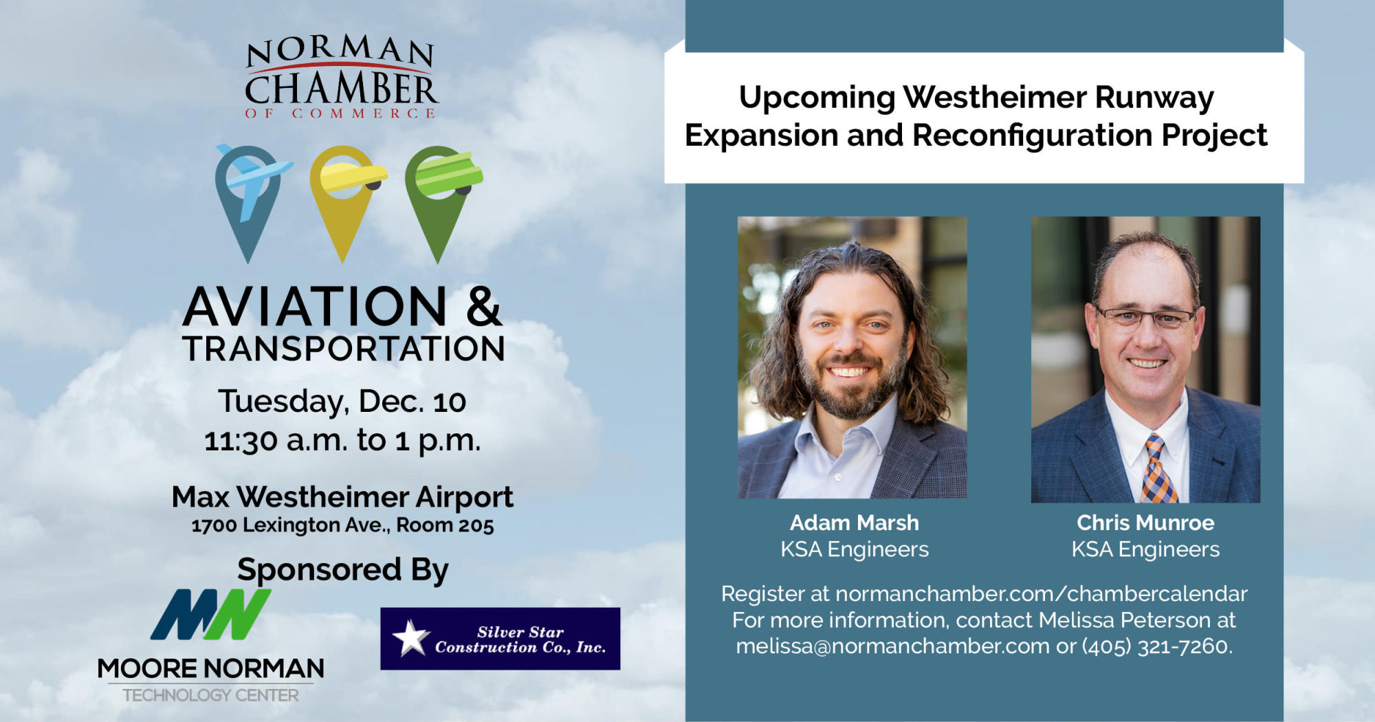 The Norman Chamber Aviation/Transportation Committee monitors aviation and transportation issues relevant to the Norman community and promotes aviation in Norman and the Max Westheimer Airport as valuable community assets.