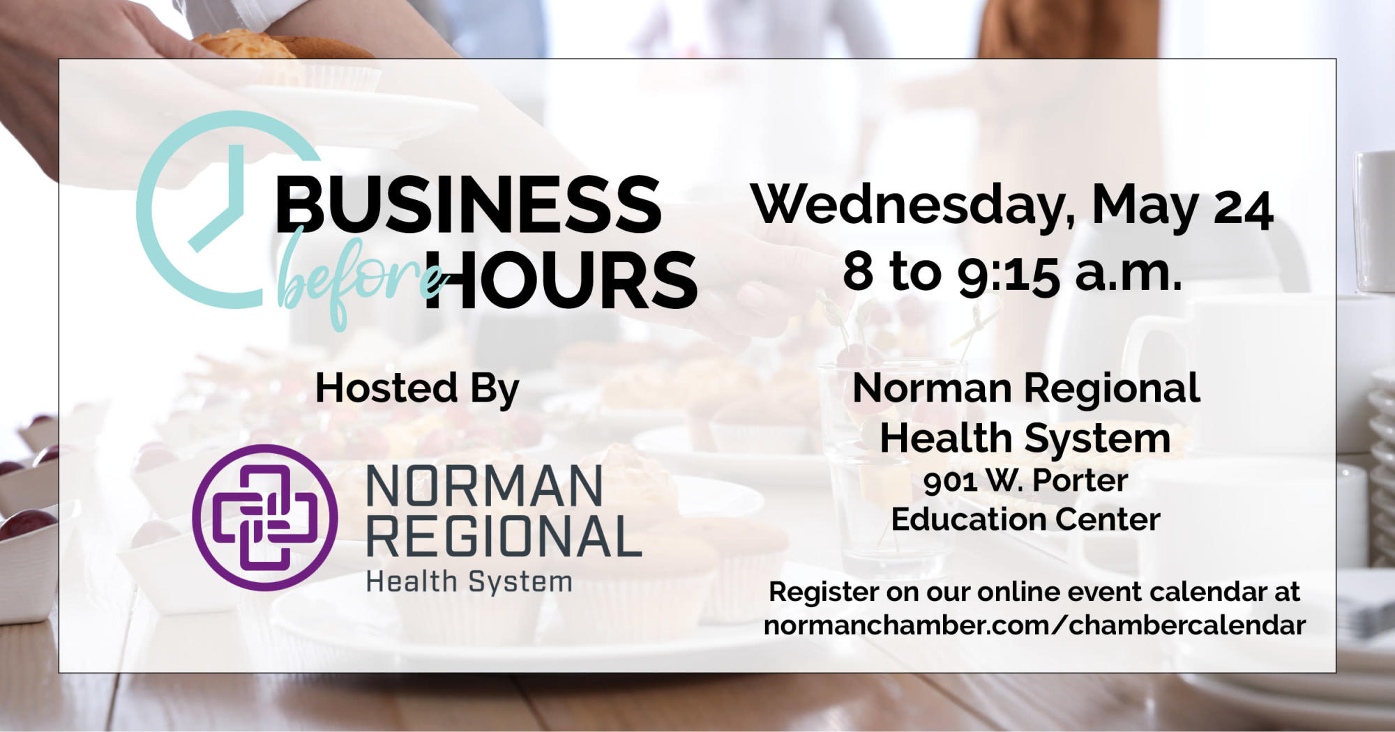 Join us for our May Business Before Hours on Wednesday, May 25, from 8-9:15 a.m., hosted by Norman Regional Health System. Start your business day networking with 25-30 other Norman business professionals. Held in the Education Center on the Northwest side of hospital. Cost is free to attend.
