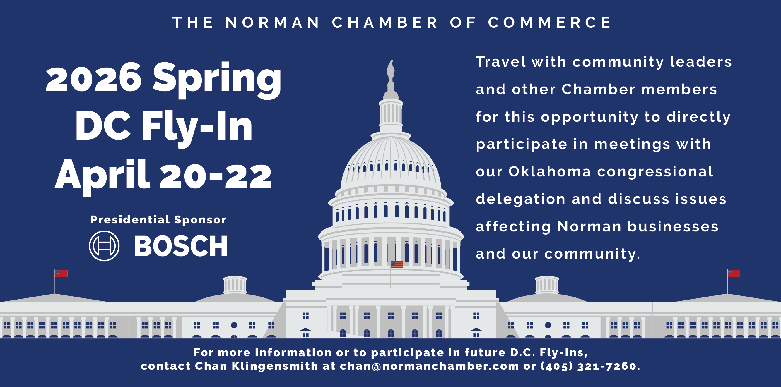 Travel with community leaders and other Chamber members for this opportunity to directly participate in meetings with our Oklahoma congressional delegation and discuss issues affecting Norman businesses and our community.