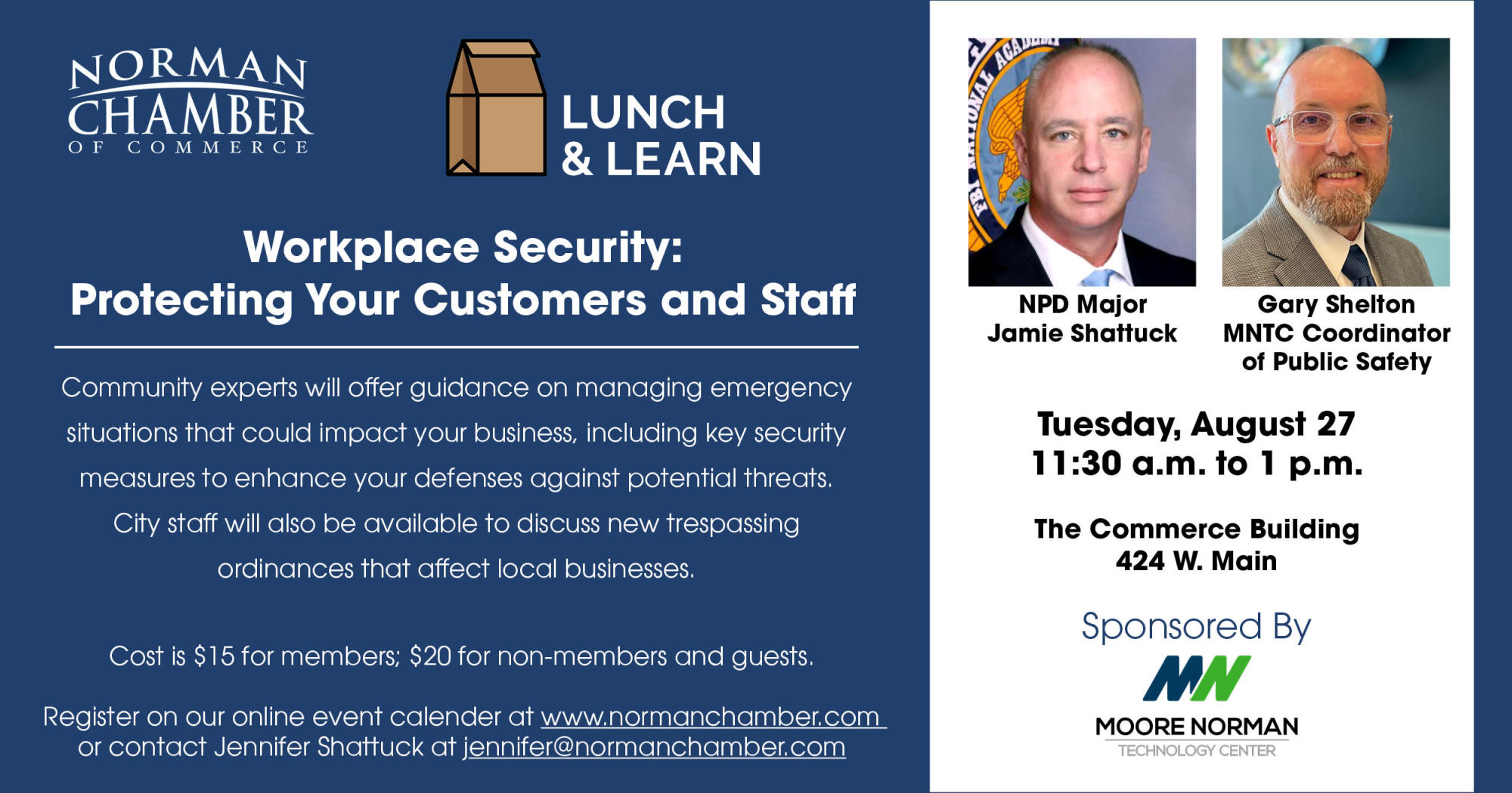 Community experts will offer guidance on managing emergency situations that could impact your business, including key security measures to enhance your defenses against potential threats. City staff will also be available to discuss new trespassing ordinances that affect local businesses. This discussion will cover best standard practices during emergency events with the focus being armed intruders. Along with some common security processes that can be instituted to help target harden your organization against armed encounters. Also, the Norman City staff from the police department, city legal, and code enforcement will be present to discuss new trespassing options for local businesses. If time allows, staff will answer any community concerns regarding community safety, homelessness, and code enforcement issues.