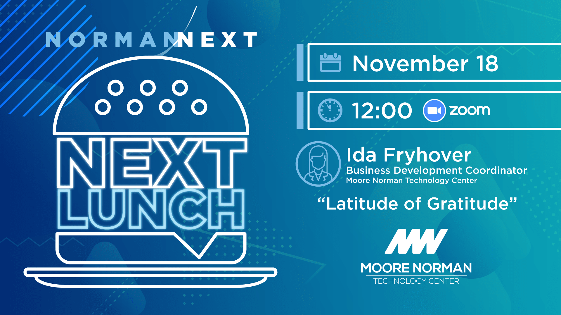 Join us via ZOOM for our NEXT Lunch on Wednesday, Nov. 18 at noon, to hear Ida Fryhover, Business Development Manager at Moore Norman Technology Center, with "Latitude of Gratitude" where she will have former MNTC students share how they learned to be grateful and appreciate a different perspective gained through leadership, mentoring, networking and volunteerism.