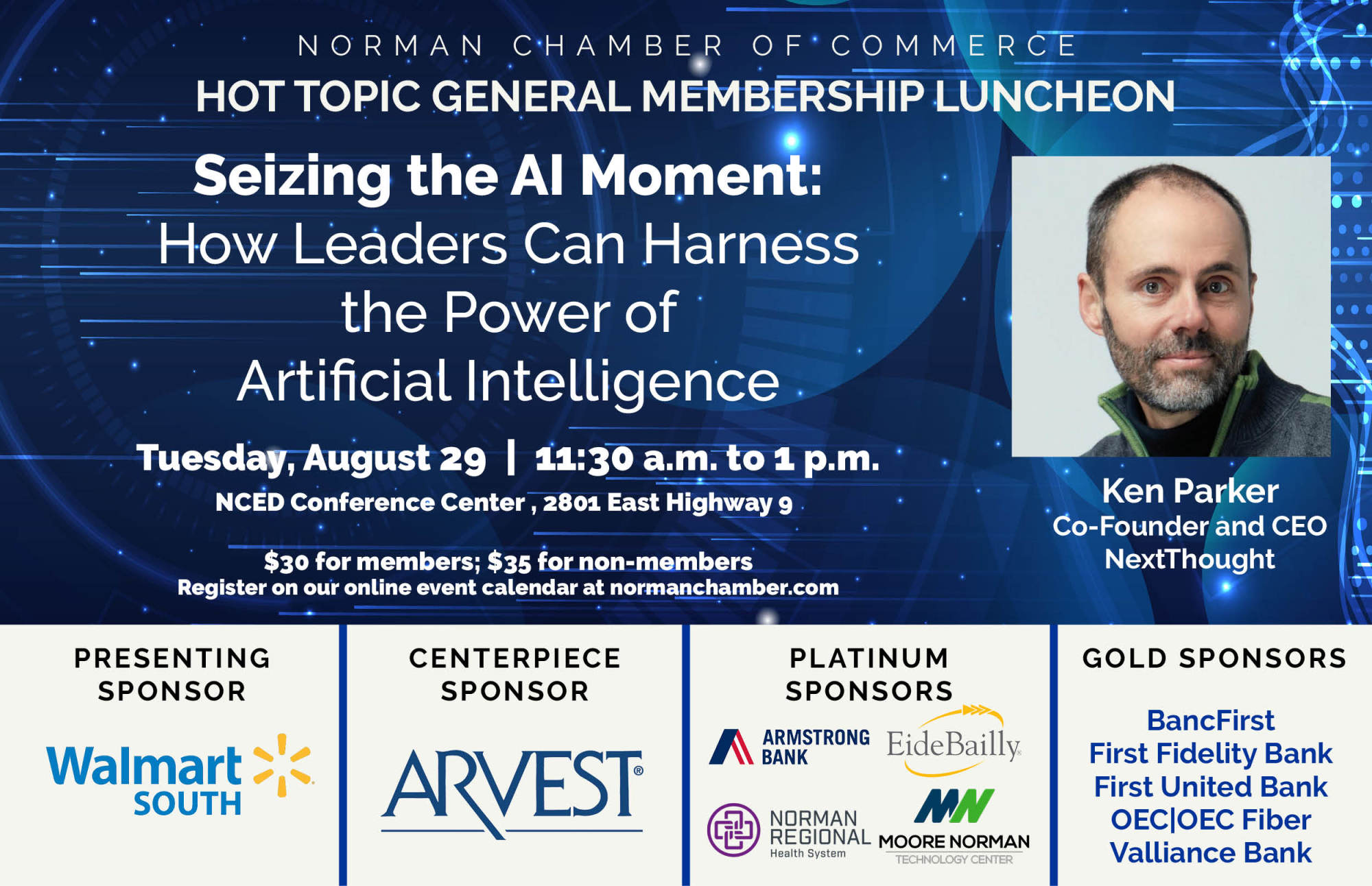 Ken Parker will share with us the trends and explore the potential for AI in business. Parker is the co-founder and CEO of NextThought, a Norman-based education technology and media company started in 2011 with the mantra, “Change the world, have fun, make money – in that order.” The NextThought platform connects people while they learn with the goal to help education become more effective and accessible.