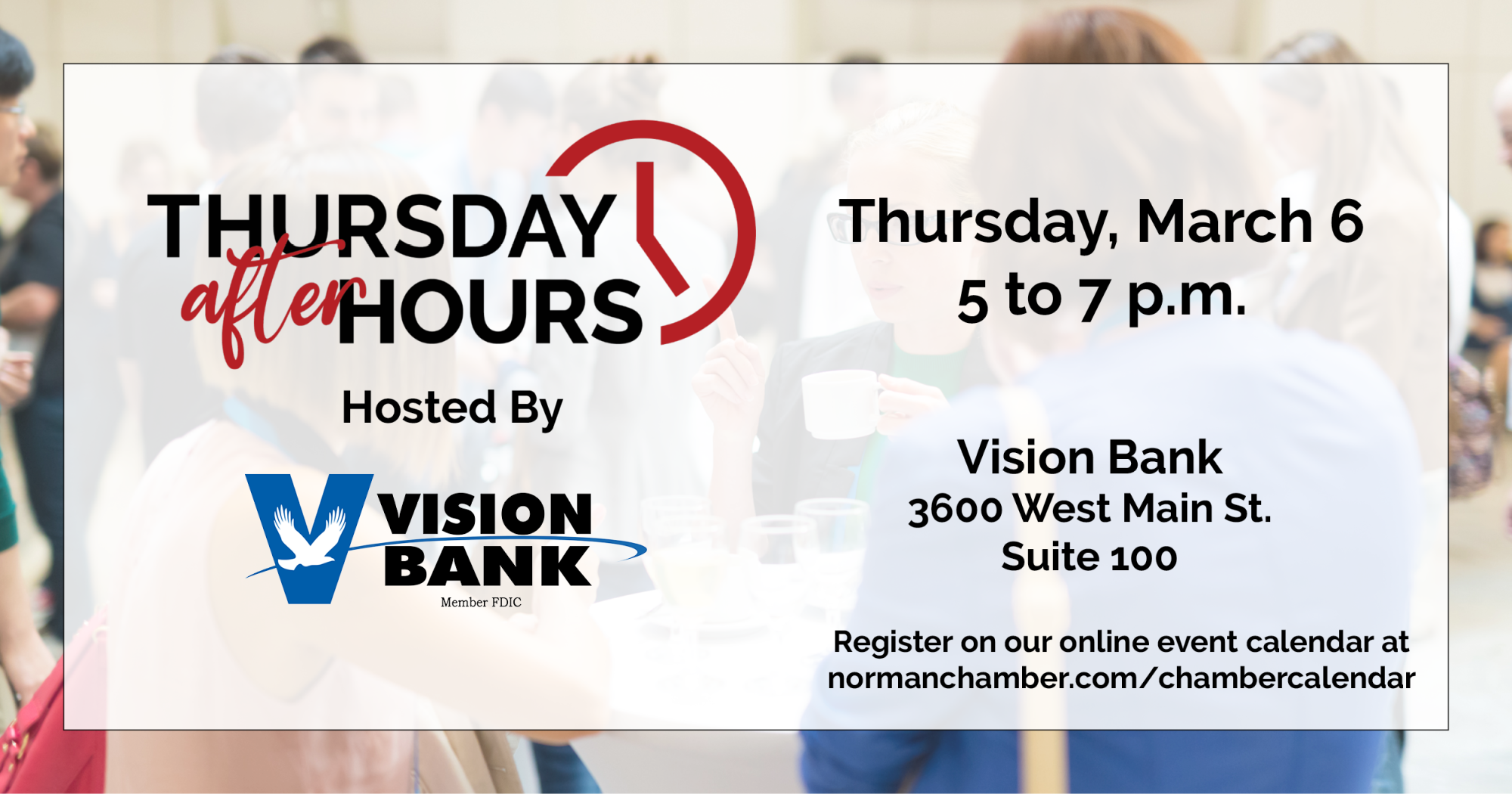 Thursday After Hours event with food, fun and networking at Vision Bank . Join us on Thursday, March 6 from 5-7 p.m. Attendance is FREE for members.