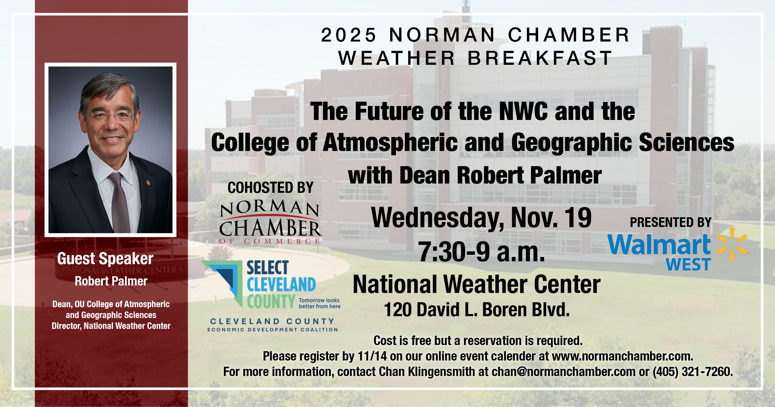 Join us for our annual Weather Breakfast at the National Weather Center on Wednesday, November 19, from 7:30 a.m.-9 a.m. Dr. Robert Palmer, Dean of the OU College of Atmospheric and Geographic Services, will be sharing information about the college, research and the National Weather Center. Palmer also serves as the Assistant Vice President of Research and Partnerships and is Director of the National Weather Center.