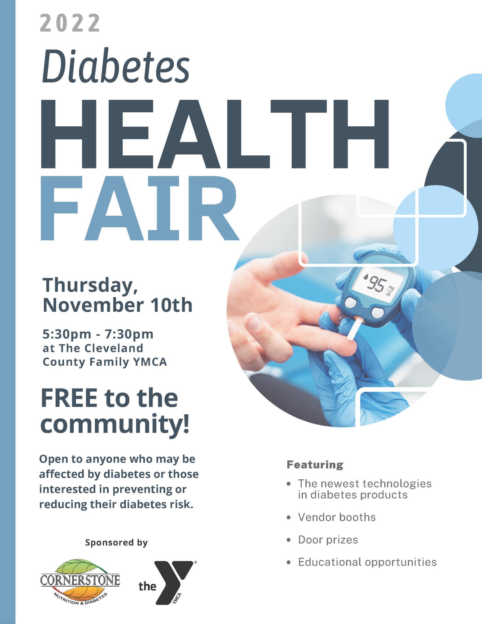 The Diabetes Health Fair is a community-wide event and open to anyone who may be affected by diabetes or those interested in preventing or reducing their diabetes risk. The fair will feature the newest technologies in diabetes products, vendor booths, door prizes, and much more. This free community event is sponsored by Cornerstone Nutrition & Diabetes and the Cleveland County Family YMCA.