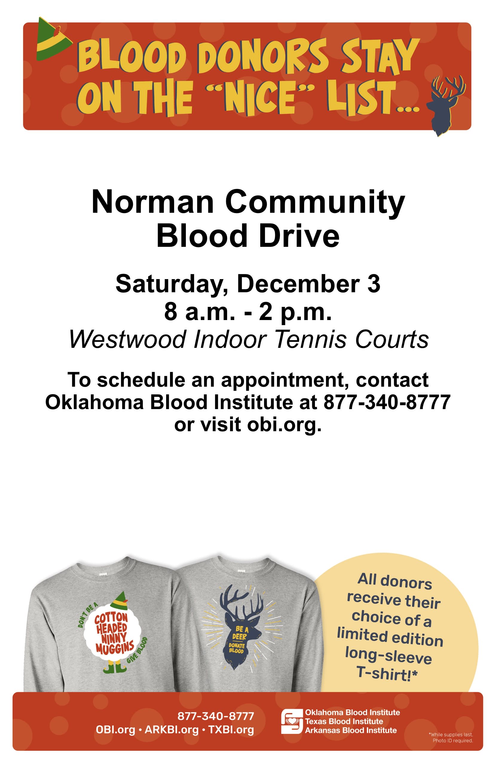 OBI is having the Norman Community Blood drive on this Saturday at the Westwood Tennis Center from 8 am to 2 pm. We are giving away a folding lawn chair to everyone who donates! Link to Sign up! https://www.yourbloodinstitute.org/donor/schedules/drive_schedule/397380Images